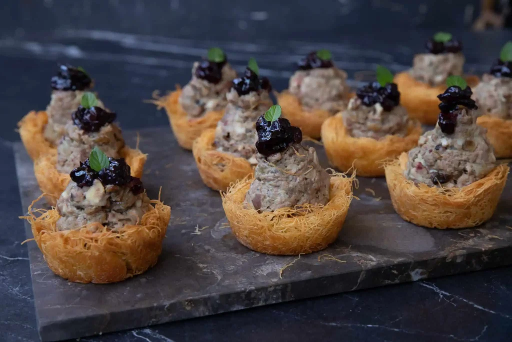 מנה אלגנטית שבה מכינים פטה כבד חלק ומתובל, ממלאים כוסות קדאיף פריך וזהוב